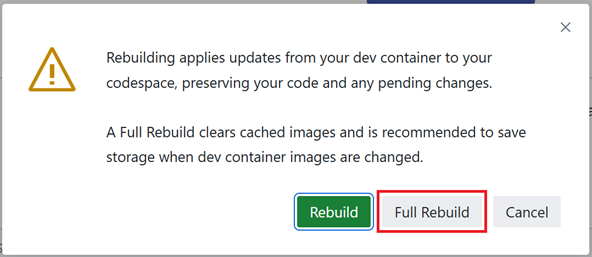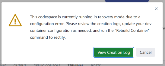 Note: If you get a warning that the codespace is currently running in recovery mode due to a configuration error, as in the following screenshot, follow the instructions in the Rebuild a codespace section.