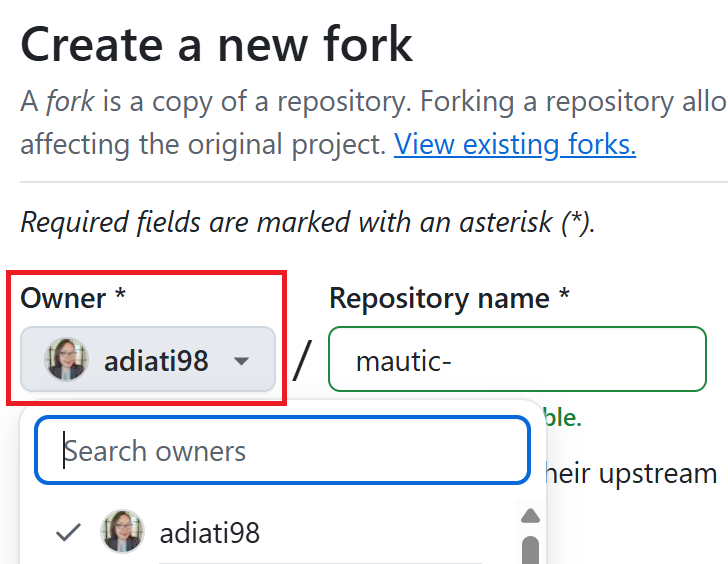 Choose your username in the ‘Owner *’ dropdown menu. Don’t select an organization here. Always choose your personal account.