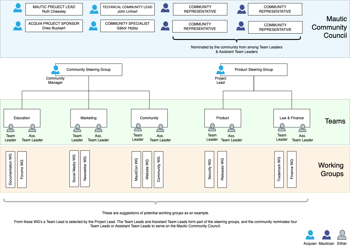 Following the acquisition of Mautic Inc. by Acquia in May 2019, which included all assets relating to the Mautic community, a governance model was proposed and adopted following a period of community consultation.
