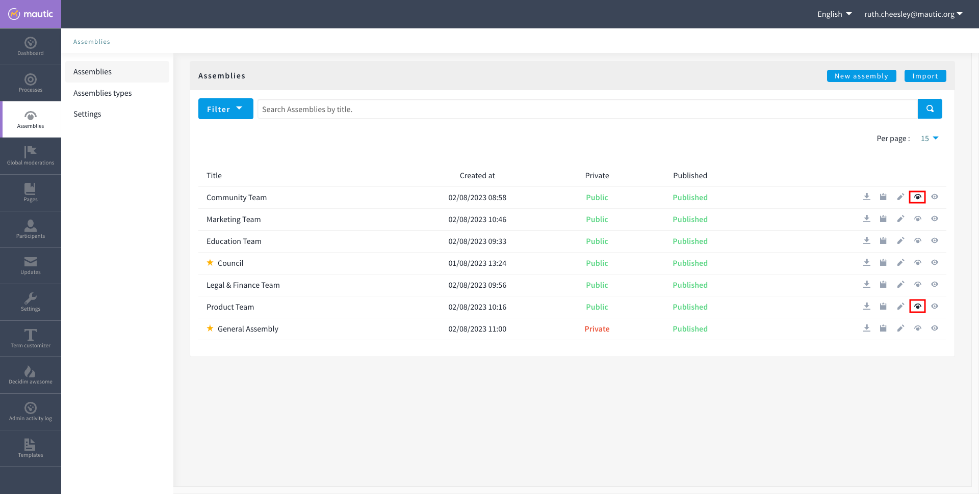 Admin panel > Participants > Participants > Show email address. The ‘Show email address’ icon resembles an open envelope.Once configured, go to ‘Info’ on the left menu when configuring the assembly, and click the ‘Publish’ button at the very bottom of the page.