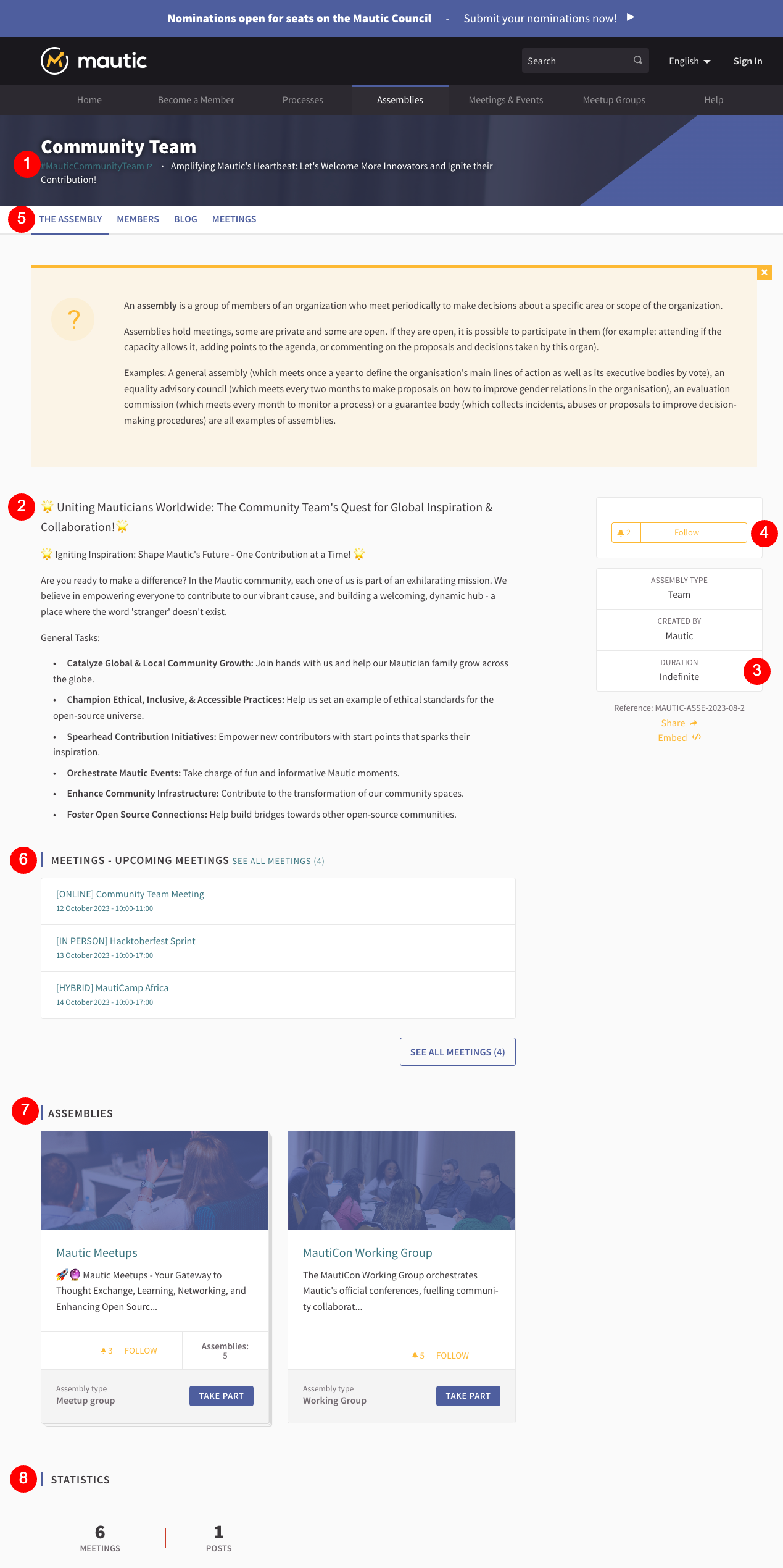 The main page for an assembly provides an overview, which is basically the charter for that organized group - what they do and why they exist.
