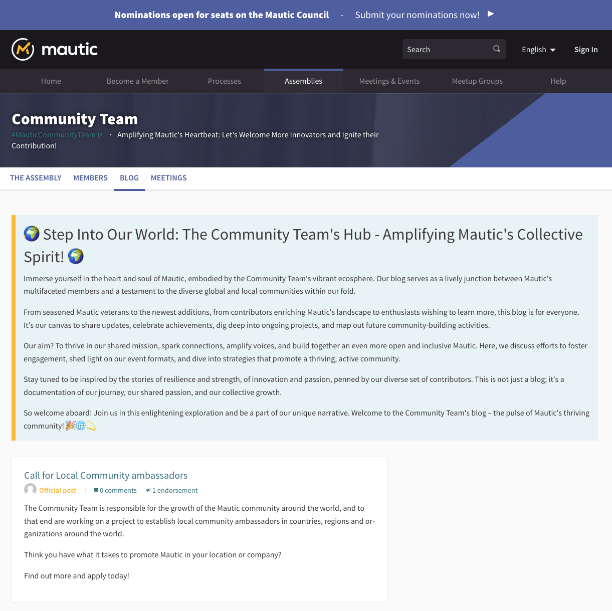 In this case, an official post from the team invites people interested in promoting Mautic in their local regions to become ambassadors and express their interest.