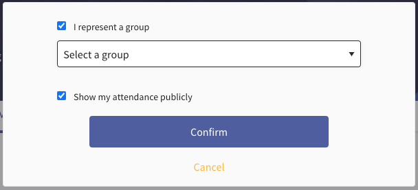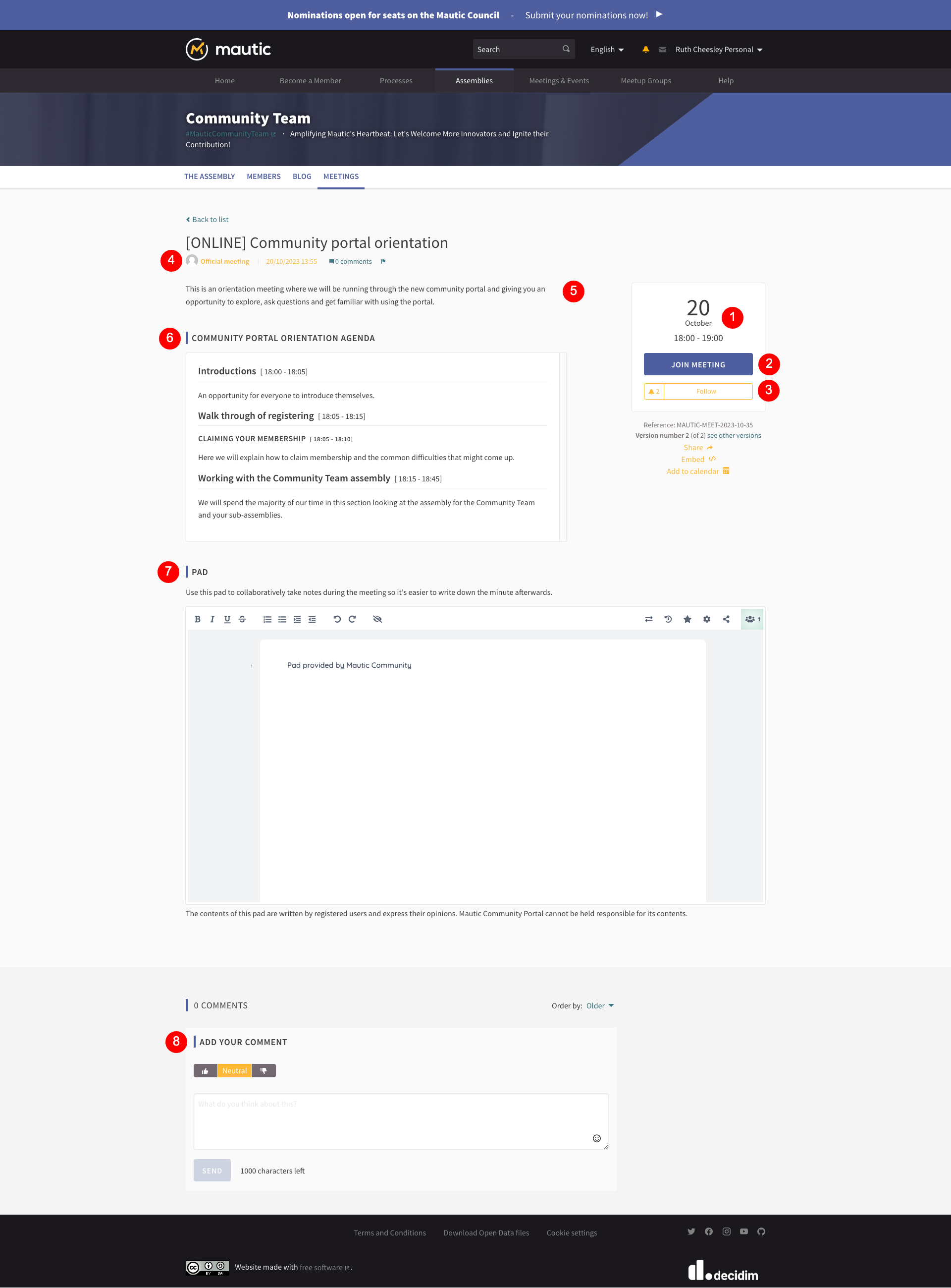 There is a button to join the meeting, which allows you to decide whether you want your participation to be shown publicly or not, and also whether you are representing a group or yourself. Sometimes a meeting uses an external ticketing system, in which case ‘Join meeting’ takes you to that system to complete the form. After registering, you gain access to the link for the online or hybrid meeting.