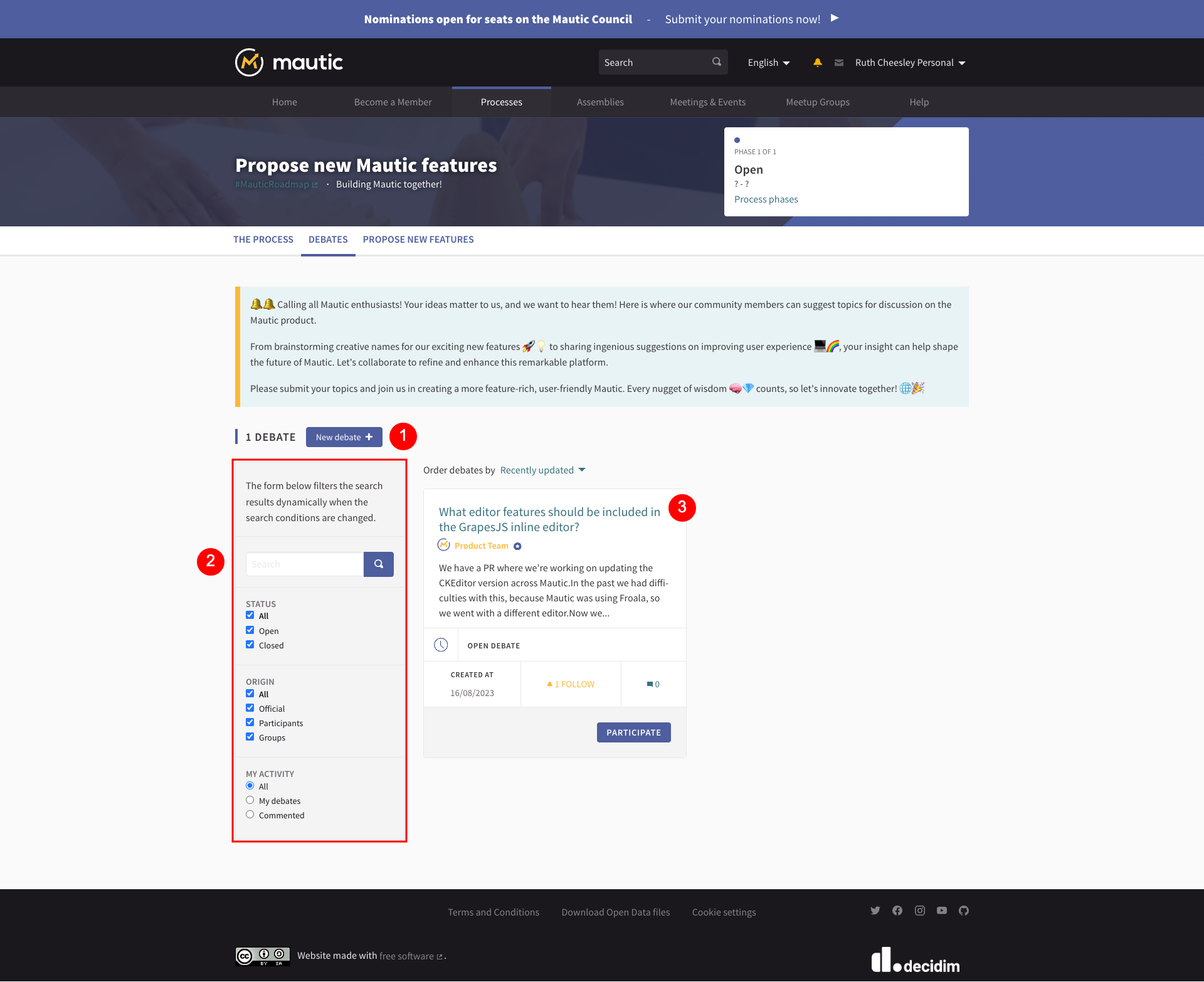 In the new features process, the component for debates is included. Any of the assemblies or processes can have the debates component available.